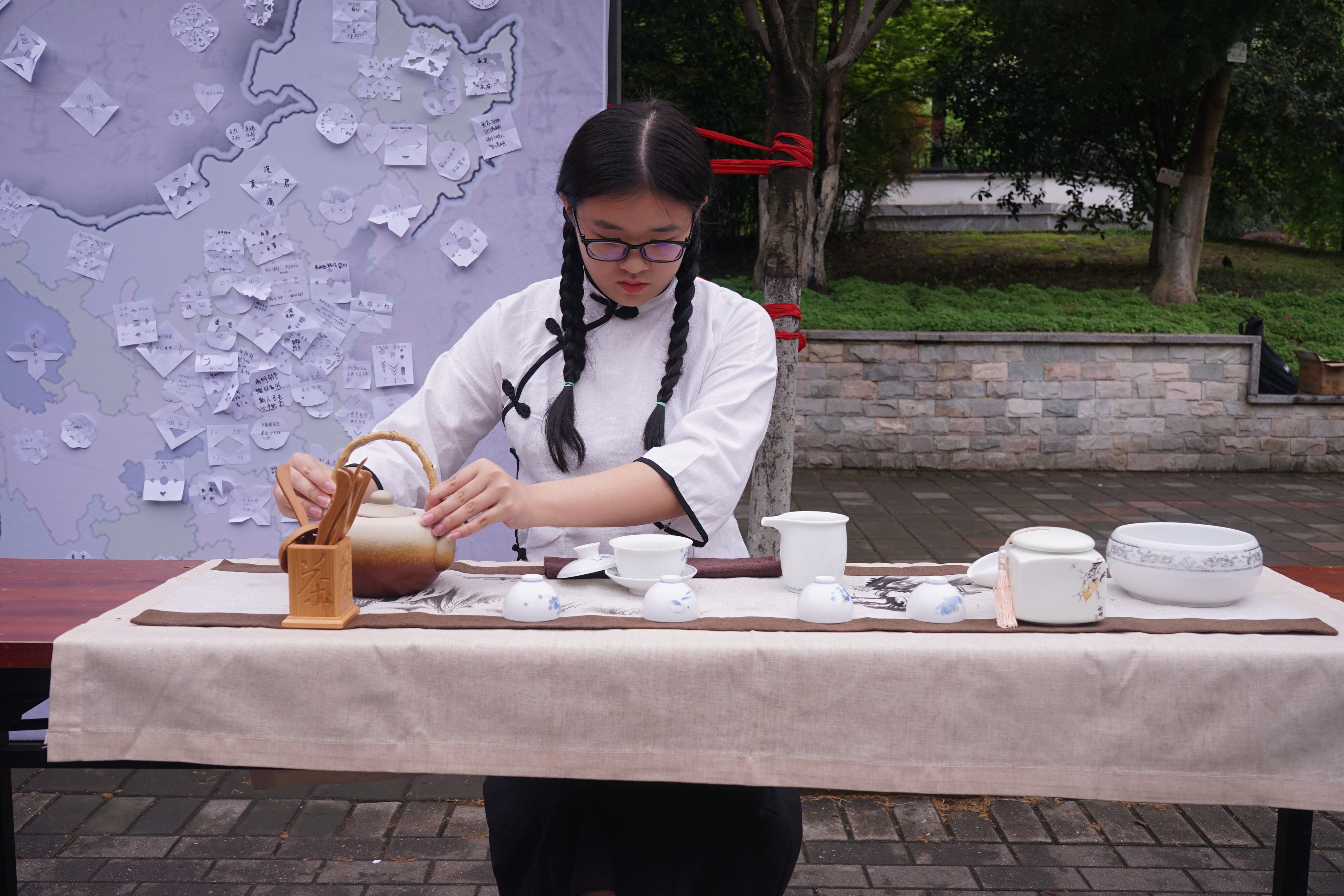 雨花茶因产于南京,状如松针,象征雨花台牺牲的革命烈士的铮铮铁骨,又能寓意英烈精神万古长青而得名,与安化松针、恩施玉露一起,被称为“中国三针”。来自南农茶艺协会的同学们为缅怀革命先烈,在茶艺表演的现场还准备了一面以中国地图为主版的海报,过往的同学们在品雨花茶的独有香味、听雨花茶过往的故事的同时,还可以将自己亲手制作的一朵朵凭吊白花贴在祖国的各个位置,献上一份给自己家乡的革命烈士悼念,寄一份缅怀,念一声敬重。