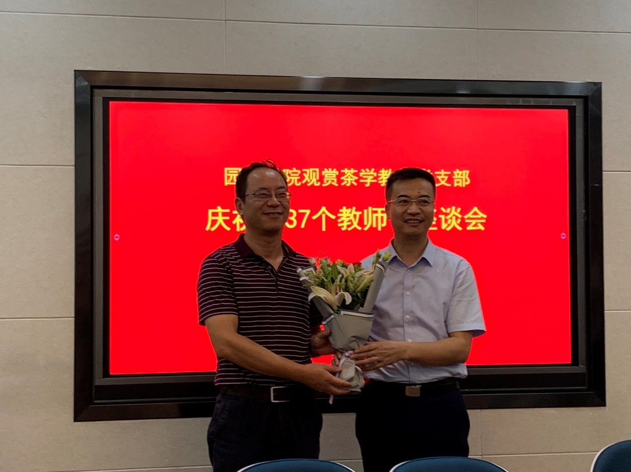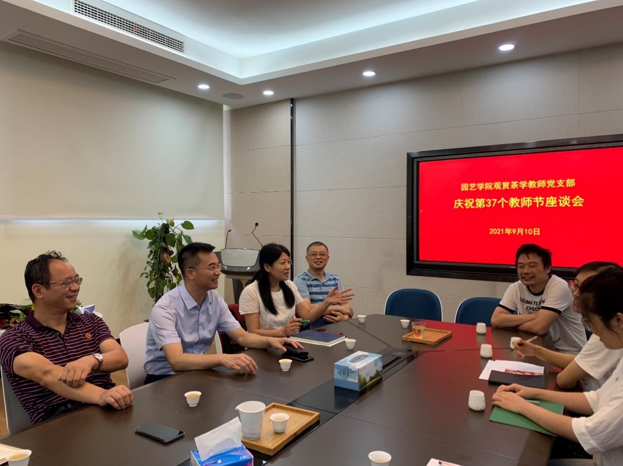 2021年9月10日,全国双带工作室观赏茶学专业教师党支部举办庆祝第37个教师节座谈会。会议邀请了成人视频校长、九三学社江苏省委副主委陈发棣教授,九三学社社员代表管志勇教授以及观赏学科丁宝清、王振兴、王利凯3位新入职教师参会。