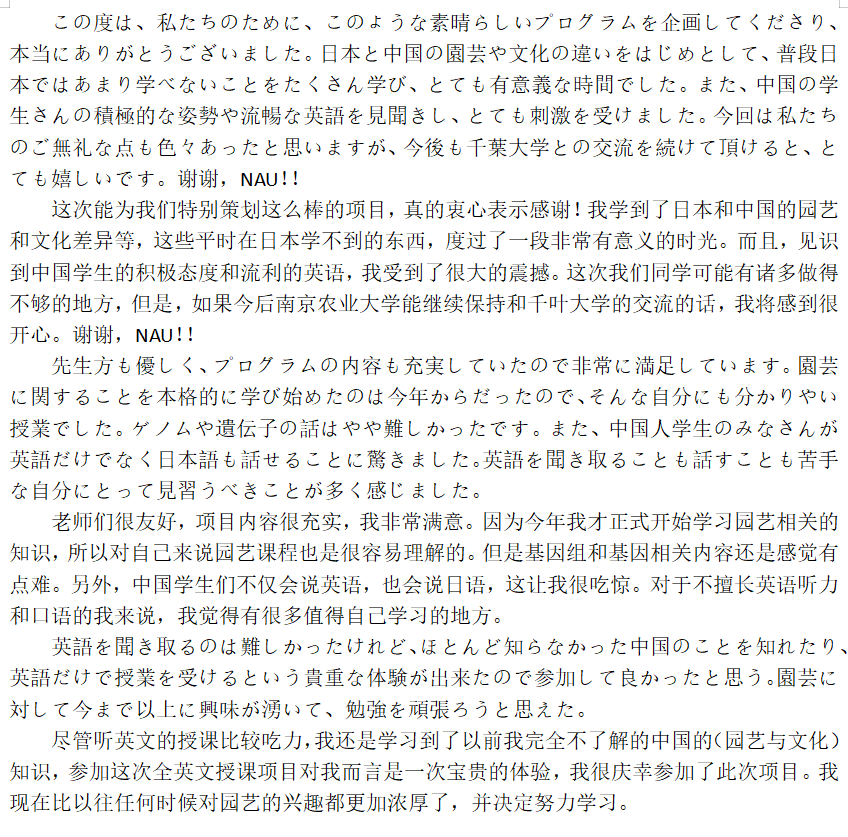 中日学生交流热烈。课前征集了中日学生感兴趣的话题,同学们就日本园艺产业发展、园产品加工、园艺交叉学科、园艺疗法、城市园艺等拟定议题进行自由发表和交流讨论,交流了先进知识、增进了了解。自由交流环节,同学们对中日两国文化、饮食等进行了自由交流,增加了对彼此文化等的了解,开拓了视野,增进了感情。交流会结束时,中日同学仍意犹未尽、依依不舍。项目还特别招募了我校日语系的学生志愿者,保障了双方自由交流过程不受语言障碍的影响。
