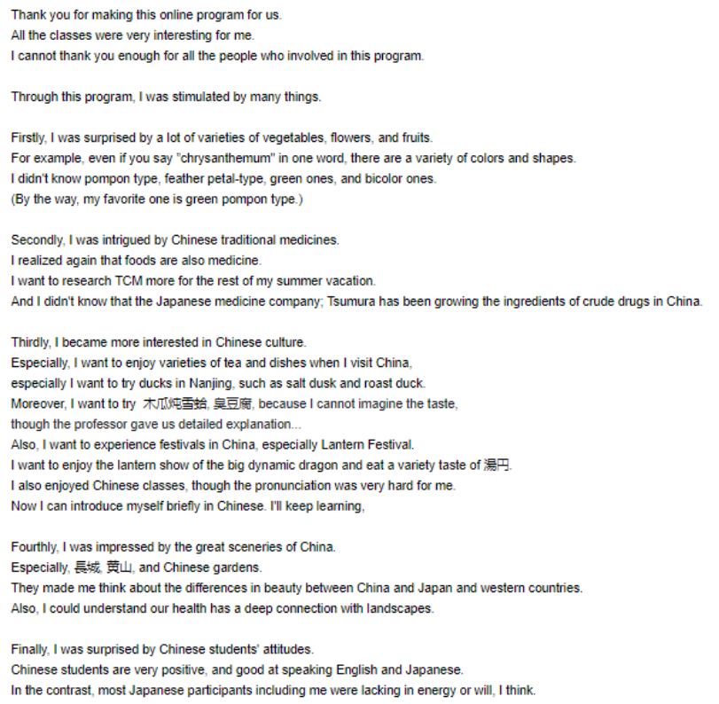 在本领域的研究优势有了深入的了解,同时,培养了日本学生对于中国文化的兴趣,践行了中国文化走出去的思想,增进了中日大学生的感情交流,日本学生纷纷表示非常荣幸有机会参加此次夏令营,收获颇丰,今后有机会将来中国留学。项目实施结束后,面向日本学生开展了授课教师、学习收获、项目组织、项目实施整体效果等的问卷调研,调研结果显示,本次国际交流项目整体评价为优良。