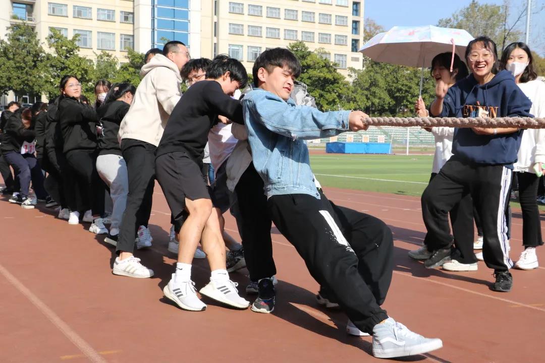“一箭易断,十箭难折”,拔河,正是一个这样“难折”的项目。红色的绳段在中线左右不断来回晃动,所有人的目光便不自觉地转移到了两边竭尽全力的“战士们”身上。“一二,一二”、“加油,加油”……此起彼伏的欢呼与呐喊让场上的气氛瞬间达到了最高峰。