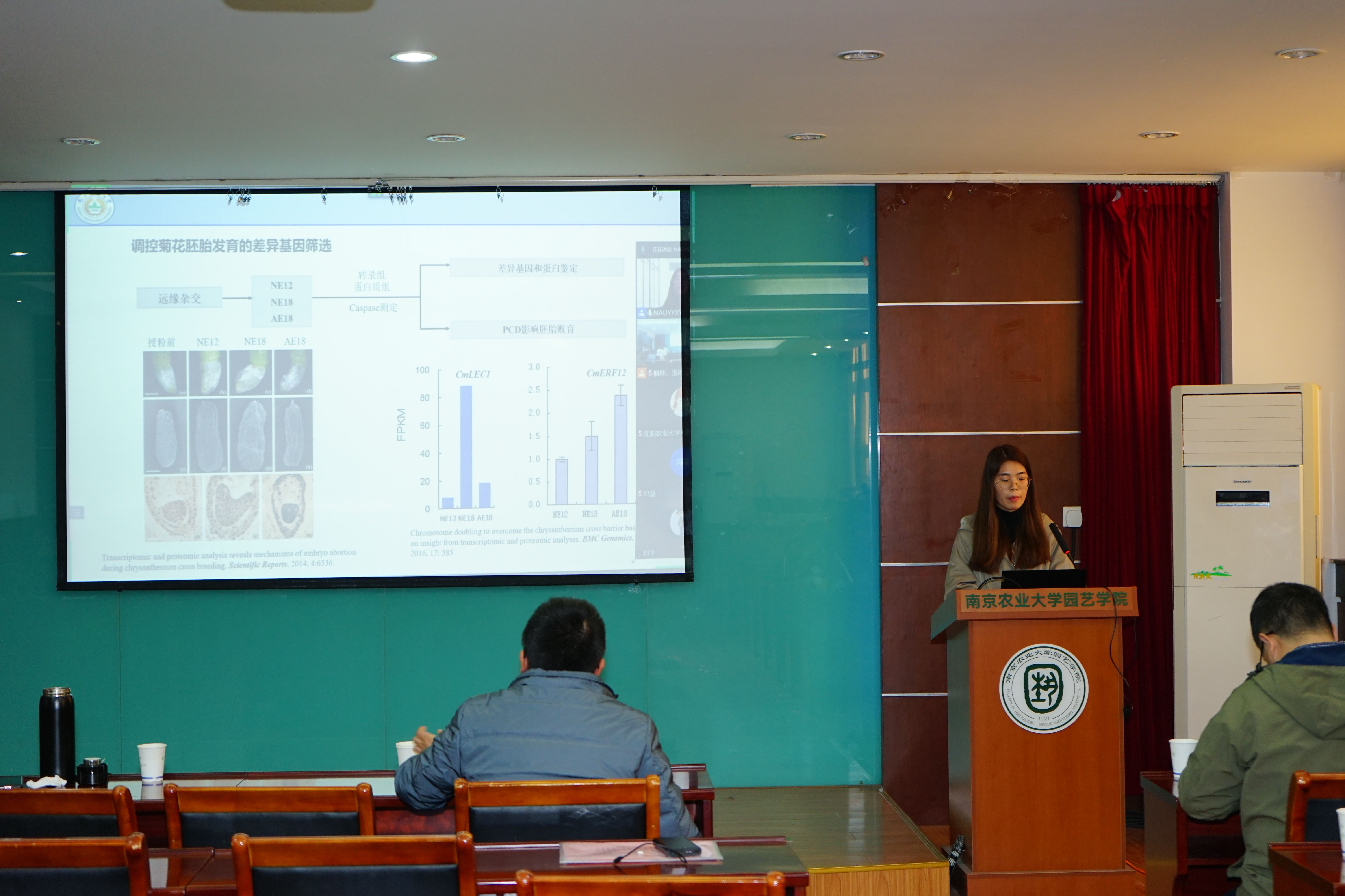 下半场报告由成人视频束胜副教授主持,成人视频徐素娟博士、成人视频黄霄博士、沈阳农业大学董诗瑶博士以及沈阳农业大学潘好斌博士带来了题为《The transcription factor CmERF12 and CmLEC1 regulate the seed-setting rate in chrysanthemum hybridization breeding》、《基于人工神经网路模型预测和优化枇杷果实品质》、《大白菜雄性不育突变基因BrMS1的克隆与鉴定》、《Muiti-microscopy technique combined with FT-IR spectroscopy reveals the histological and biochemical causes leading to the difference in fruit texture of oriental melon(Cucumis melo var.makuwa Makino)》的精彩报告,展现了园艺领域博士研究生的科研创新能力。