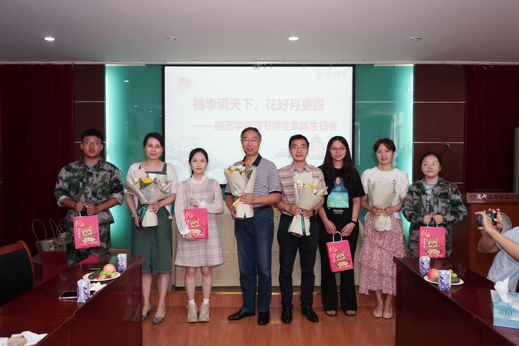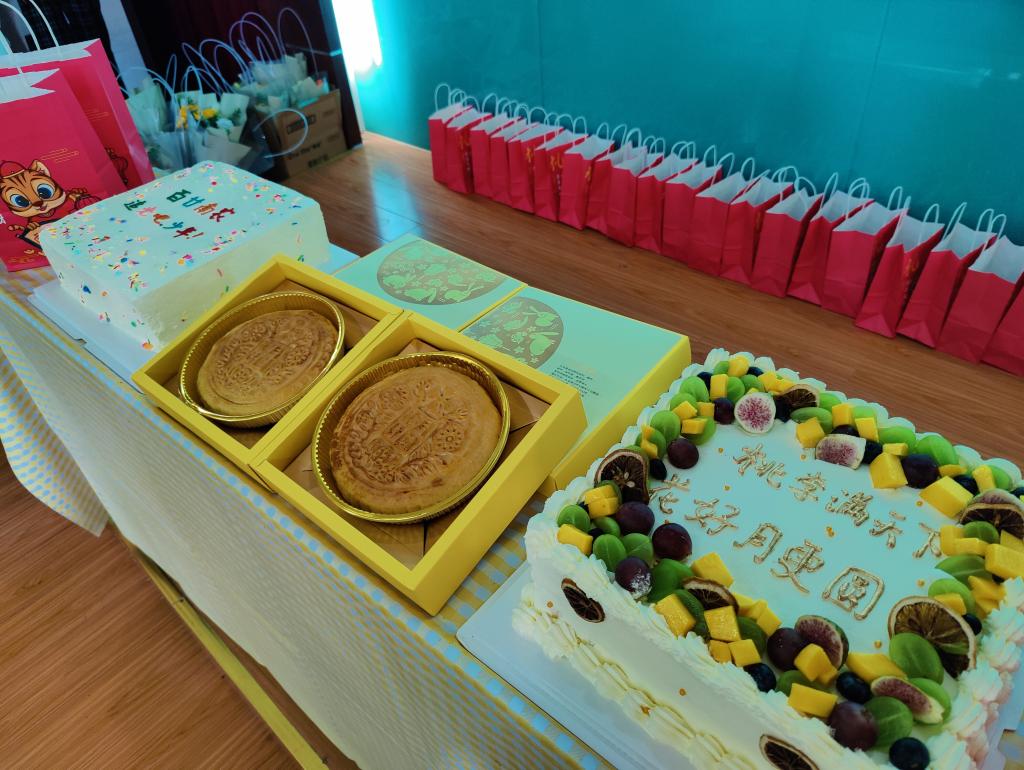 领导和寿星师生们一起切蛋糕、分月饼,同学们把提前准备好的鲜花送给老师,祝福老师们教师节快乐,老师们也为每位同学精心准备了小礼品,希望他们的大学生活能够多姿多彩、充满爱意。