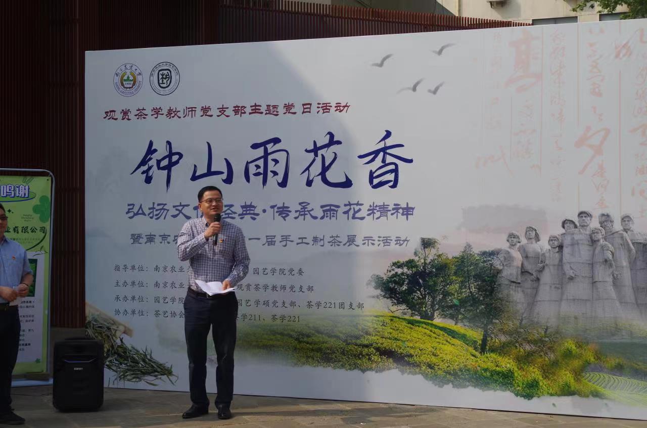 党委指导下,全国高校首批双带党支部、全国高校样板党支部——观赏茶学专业教师党支部,联合观赏园艺学硕党支部、茶艺协会、茶学专业本科生开展了以“钟山雨花香”弘扬茶文化、传承雨花精神为主题的党日活动暨成人视频第一届手工制茶展示活动。活动涵盖传统雨花茶制茶技艺展示、手工制茶体验、深加工产品展示和茶文化知识科普竞答四个部分。校党委副书记刘营军出席活动,学工处、校团委、园艺院相关负责同志,江苏省教育厅电化教育馆相关工作人员,观赏茶学教师党支部党员教师、观赏园艺学硕党支部和茶学专业团支部同学参加。