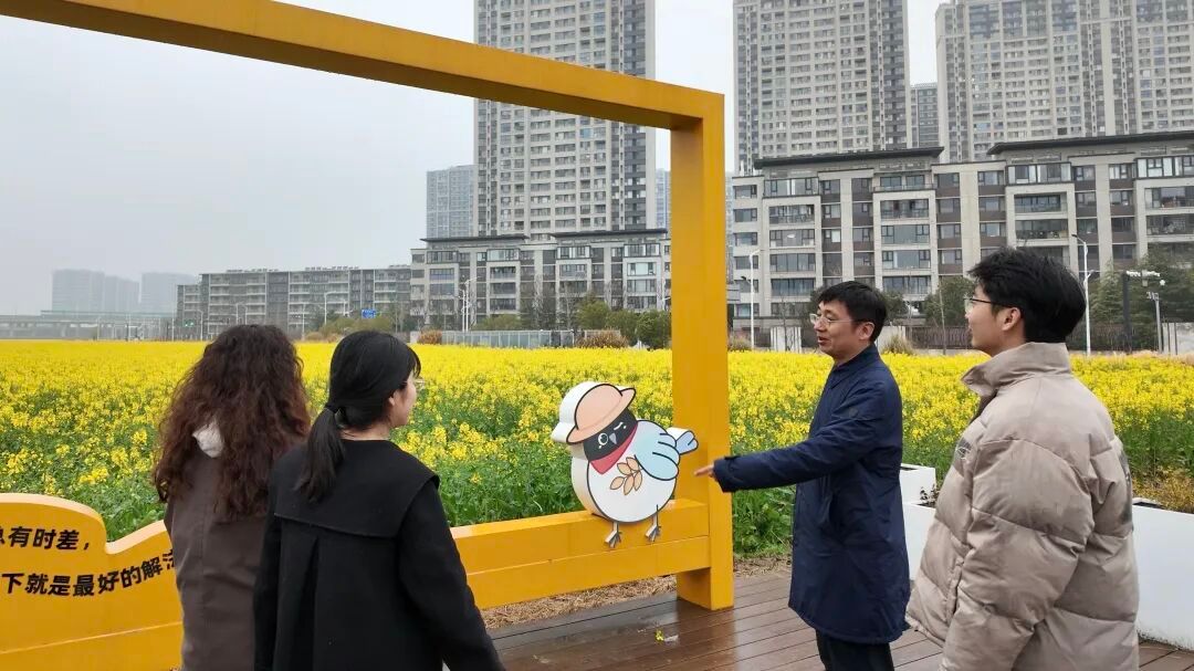 眼下,南京江北新区的一片都市田园春意盎然,连片油菜花竞相绽放,花海与大地艺术景观相映成趣,浦云路大桥等地标融入田园野趣。市民和游人徜徉花间,感受着乡土田园带来的身心疗愈。