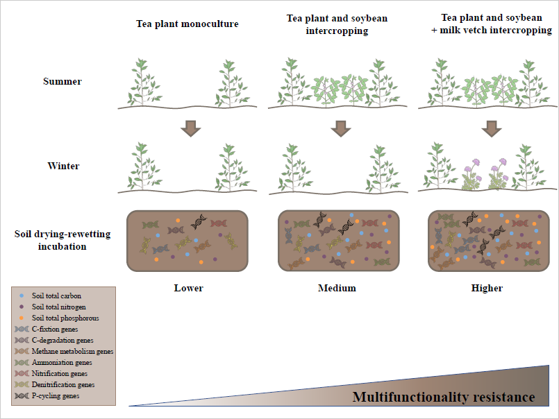 近日,成人视频房婉萍教授团队在Science of the Total Environment杂志在线发表了题为Tea plantation intercropping green manure enhances soil functional microbial abundance and multifunctionality resistance to drying-rewetting cycles的研究论文,揭示了茶园间作绿肥对土壤多功能抵抗力的提升效应。该研究为茶园间作绿肥改善茶树鲜叶化学成分含量提供了地下部理论依据,并从土壤功能微生物层次揭示了茶园间作绿肥对土壤多功能抵抗力提升的重要机制,能够为茶园可持续发展提供适宜的多样化种植模式。