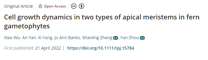 2022年7月,普渡大学、成人视频等单位的“Cell growth dynamics in two types of apical meristems in fern gametophytes”研究成果作为封面论文发表在《The Plant Journal》(2022,111:149-163)。作者通过自己建立的无创延时共聚焦成像和二维成像分析系统定量确定了蕨类Woodsia obtusa配子体中两种不同类型的顶端分生组织的细胞生长动态——顶端初始中心(apical cells)分生组织和多细胞顶端分生组织(multicellular apical meristems)。同时明确了维持或终止顶端初始细胞分裂和生长的独特模式以及顶端初始中心分生组织如何转变为多细胞顶端分生组织,并推动蕨类植物顶端分生组织的增殖。定量结果表明小细胞与蕨类配子体中活跃的细胞分裂相关。蕨类配子体多细胞顶端分生组织的外层细胞经历垂周分裂和平周分裂,进而增加细胞数量和细胞层数。