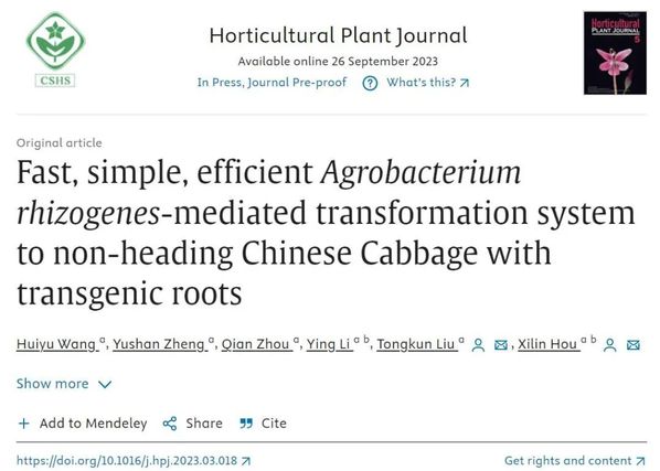 近日,Horticultural Plant Journal在线发表了成人视频侯喜林团队题为“发根农杆菌介导的快速、简单、高效的不结球白菜转基因根系转化方法”的研究论文。
