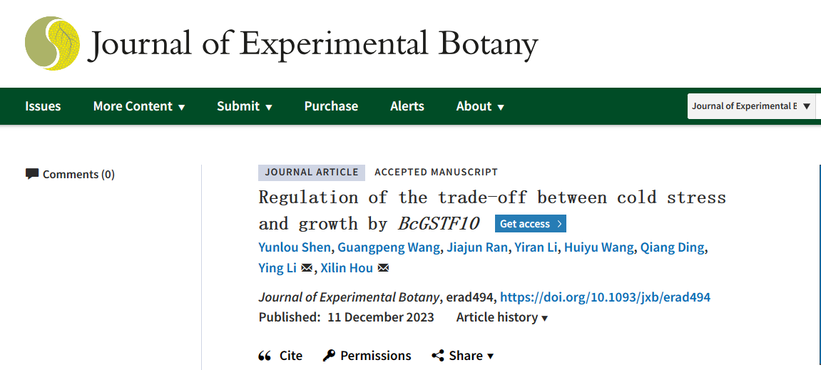 近日,成人视频白菜系统生物学创新团队在JOURNAL OF EXPERIMENTAL OF BOTANY在线发表了题为“Regulation of the trade-off between cold stress and growth by BcGSTF10”的研究论文。该研究揭示了BcGSTF10基因在协调植物生长发育和低温响应中的分子机理。