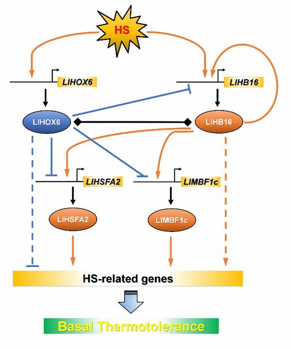该研究通过对百合高温胁迫的叶片转录组进行差异表达基因分析,分离并鉴定了一个受高温诱导表达的HD-Zip I-γ亚家族基因LlHOX6,其在基础耐热性的建立中发挥负调控作用。LlHOX6的表达可被高温快速激活,其蛋白定位于细胞核中。在拟南芥和百合中的过表达LlHOX6降低它们的基础耐热性,但在百合中沉默LlHOX6增强了基础耐热性。在体内共过表达或共沉默LlHOX6和LlHB16损害了它们各自调节基础耐热性的功能。LlHOX6可以与自身及LlHB16蛋白互作,且异源互作强度大于同源互作。值得注意的是,LlHOX6能够直接结合启动子的DNA元件来抑制LlHB16靶基因LlHSFA2和LlMBF1c的表达。此外,LlHB16可以激活自身的基因表达形成正反馈回路,与之相反,LlHOX6抑制LlHB16的表达。LlHOX6/LlHB16异源聚合物表现出更强的DNA结合能力来竞争LlHB16同源低聚物的DNA结合,从而降低了LlHB16对LlHSFA2和LlMBF1c的转录激活能力,并削弱了其自激活调控。综上,这些研究结果表明,LlHOX6与LlHB16相互作用,限制了其转录激活功能,从而削弱了百合的高温胁迫响应。