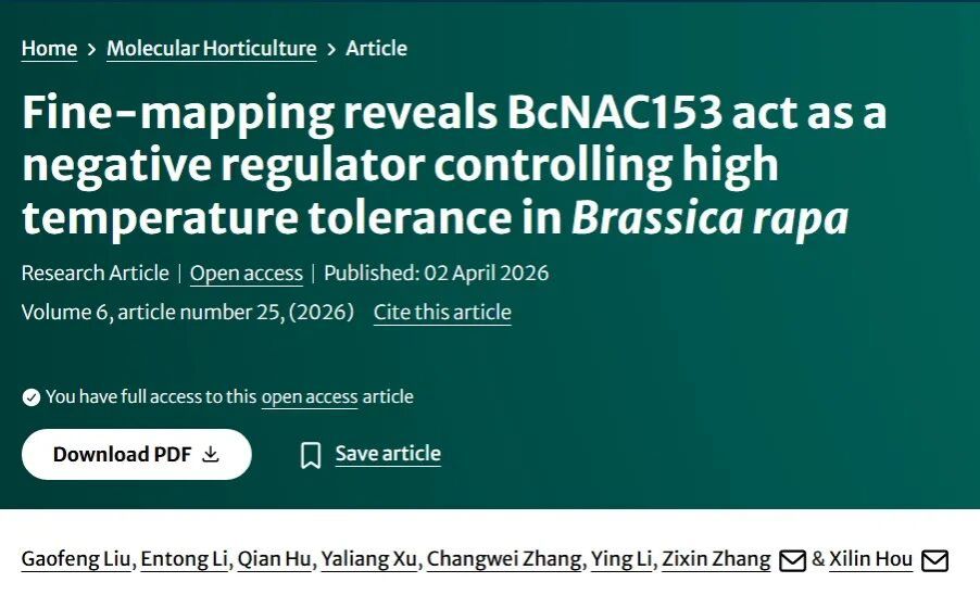 近日,《Molecular Horticulture》在线发表了成人视频侯喜林教授团队题为“Fine-mapping revealsBcNAC153act as a negative regulator controlling high temperature tolerance inBrassica rapa”的研究论文。该研究通过构建高密度遗传图谱,成功鉴定到一个调控不结球白菜高温耐受性的关键负调控因子BcNAC153,并系统解析了其在高温胁迫响应中的作用机制,为耐热蔬菜品种的分子育种提供了新靶点。